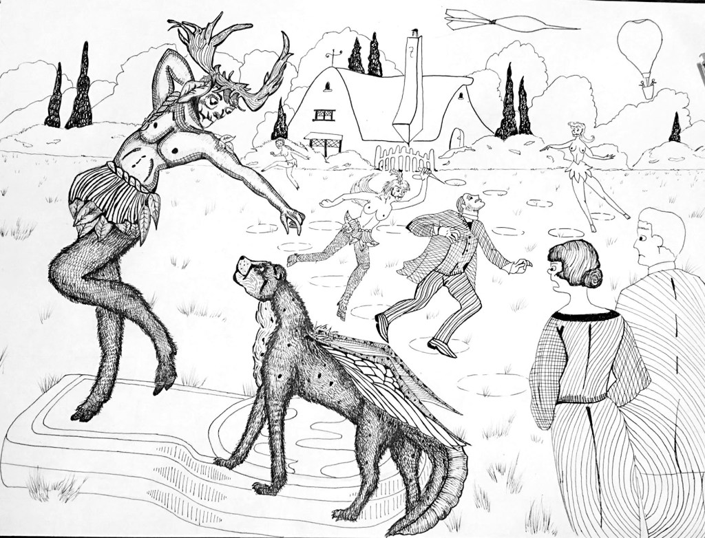 Final Steam Punk Drawing. This image reveals a fantasy about the Garden of Eden. Here, the deer/human figures chase away what they deem as man’s sins or transgressions, in order to maintain order and peace.